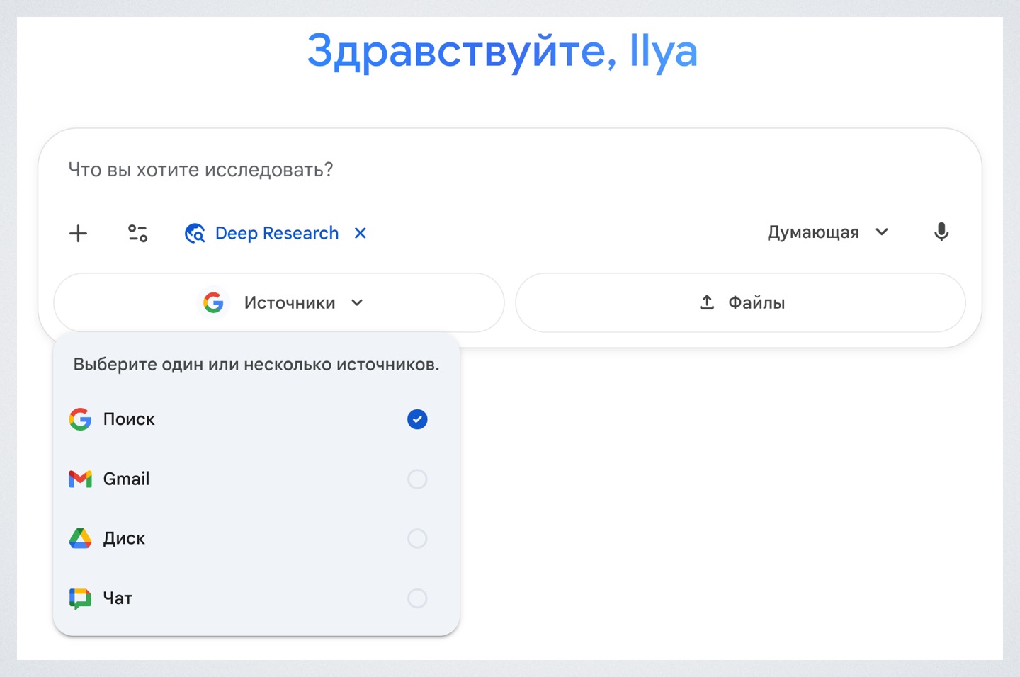 Помимо источников из интернета,Deep Research может анализировать вашу почту Gmail, файлы на Google Диске, переписки в Google Chat и любые другие ваши файлы. Это позволяет Gemini работать с теми источниками, которые другим чат-ботам просто недоступны.