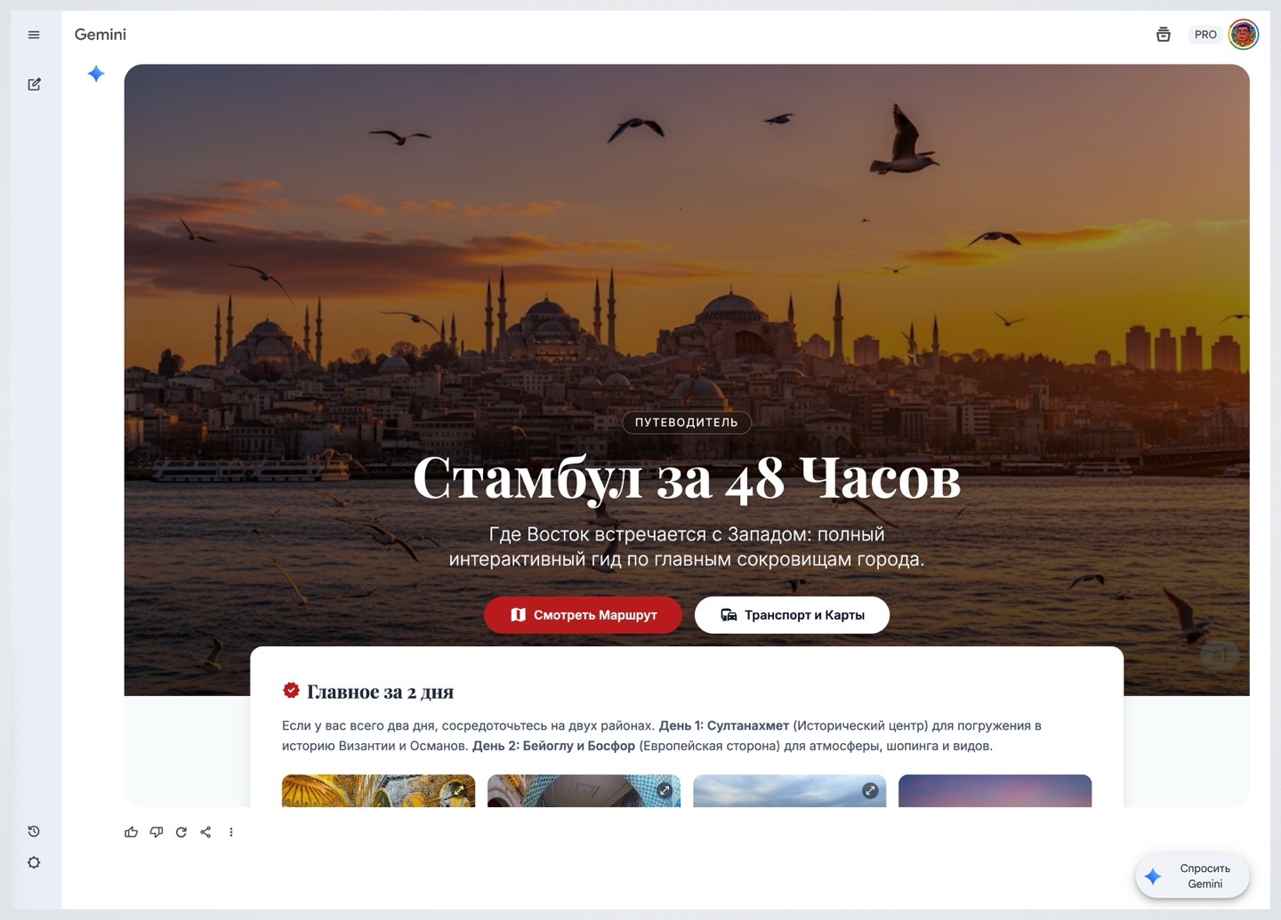 Например, её можно использовать для планирования путешествия. Gemini создаст полноценный небольшой сайт с фотографиями и кратким описанием достопримечательностей, ресторанов, а также составит маршрут и покажет цены на общественном транспорте.