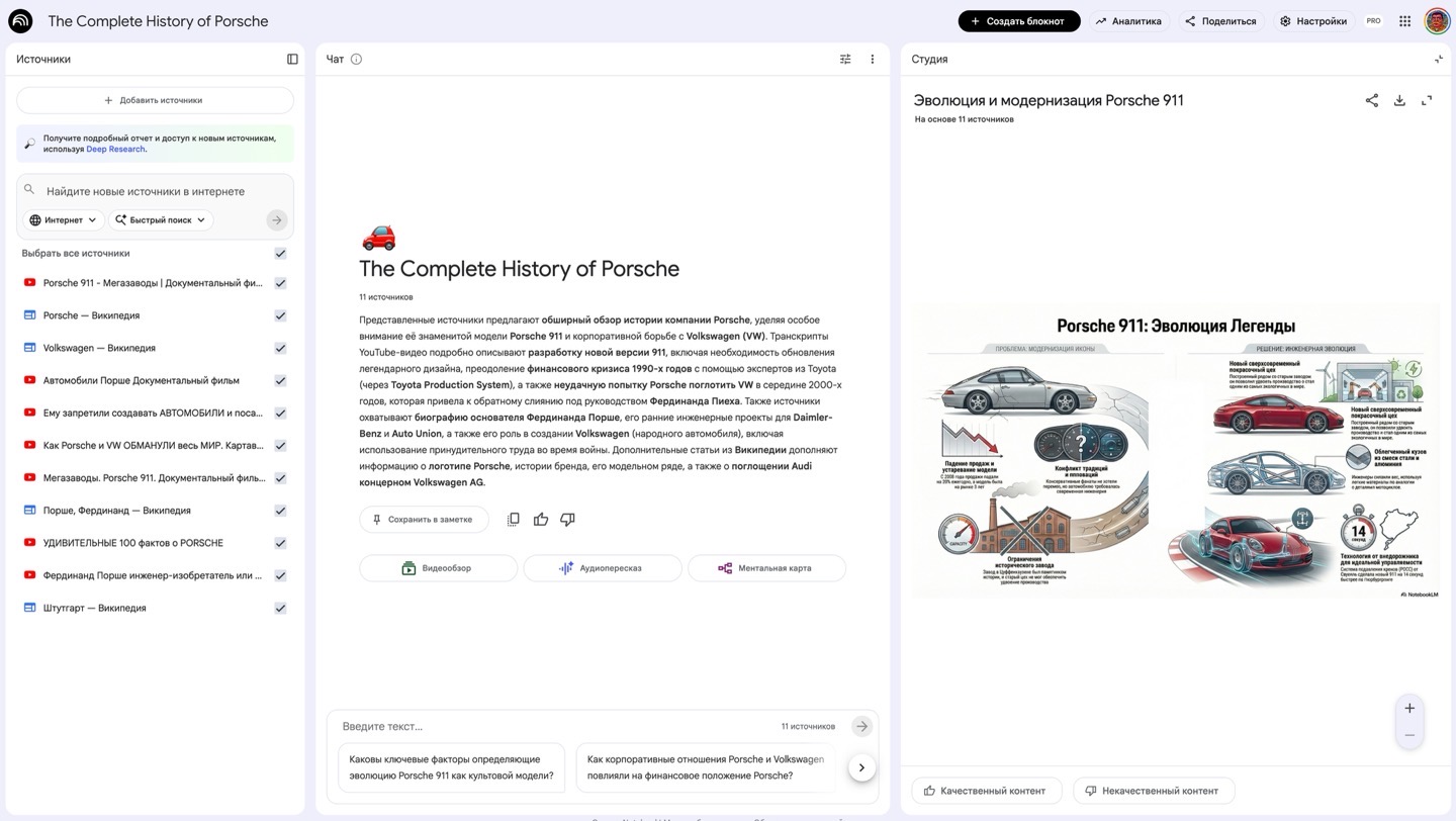 Затем, когда вы задаёте вопрос, он ищет ответ среди ваших источников. Кроме того, NotebookLM может создавать подкасты, видеопересказы, карточки, инфографики, презентации и тесты на основе вашей базы данных.