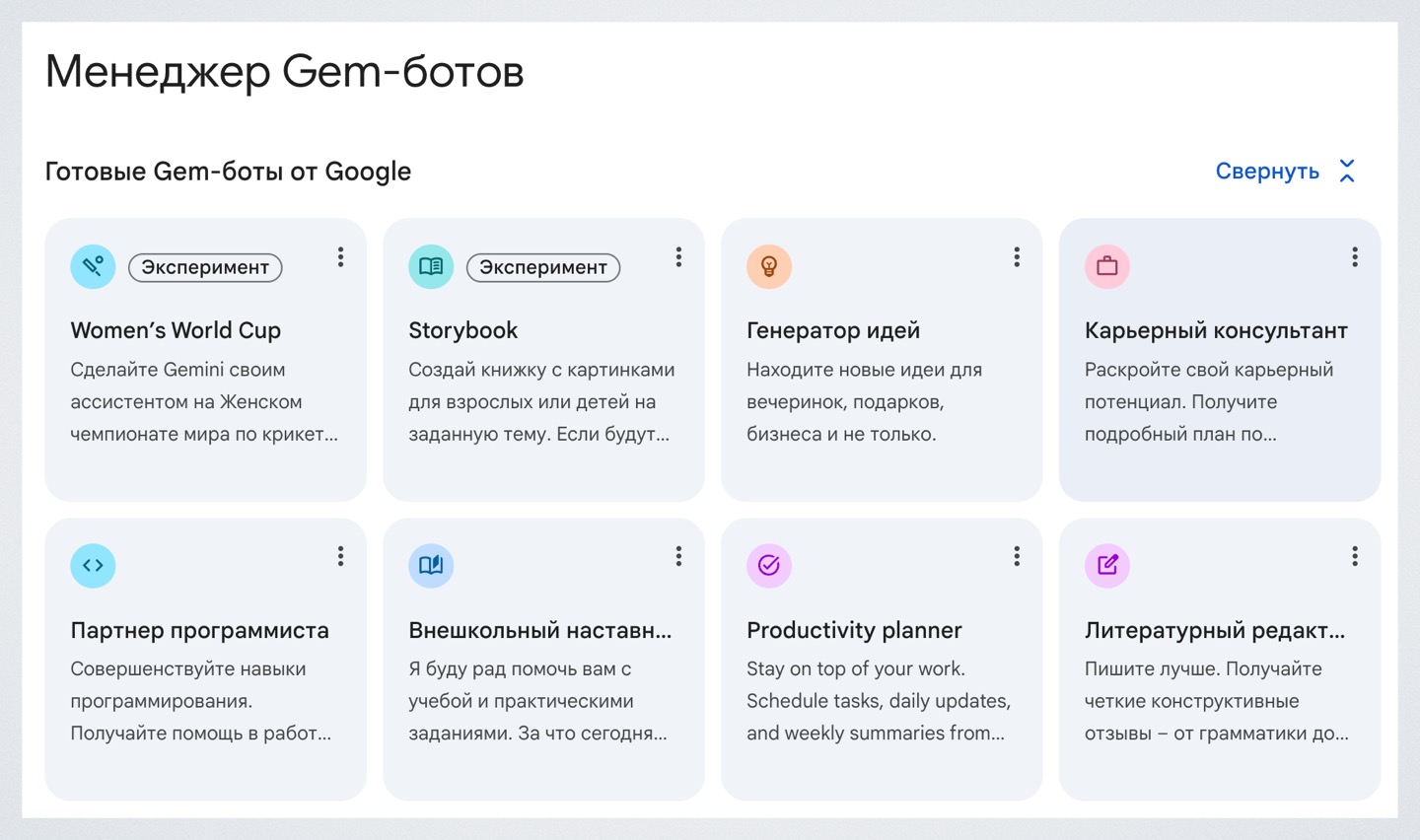 Gemini, как и ChatGPT, позволяет пользователям создавать своих чат-ботов, которые могут выполнять строго определённые инструкции.