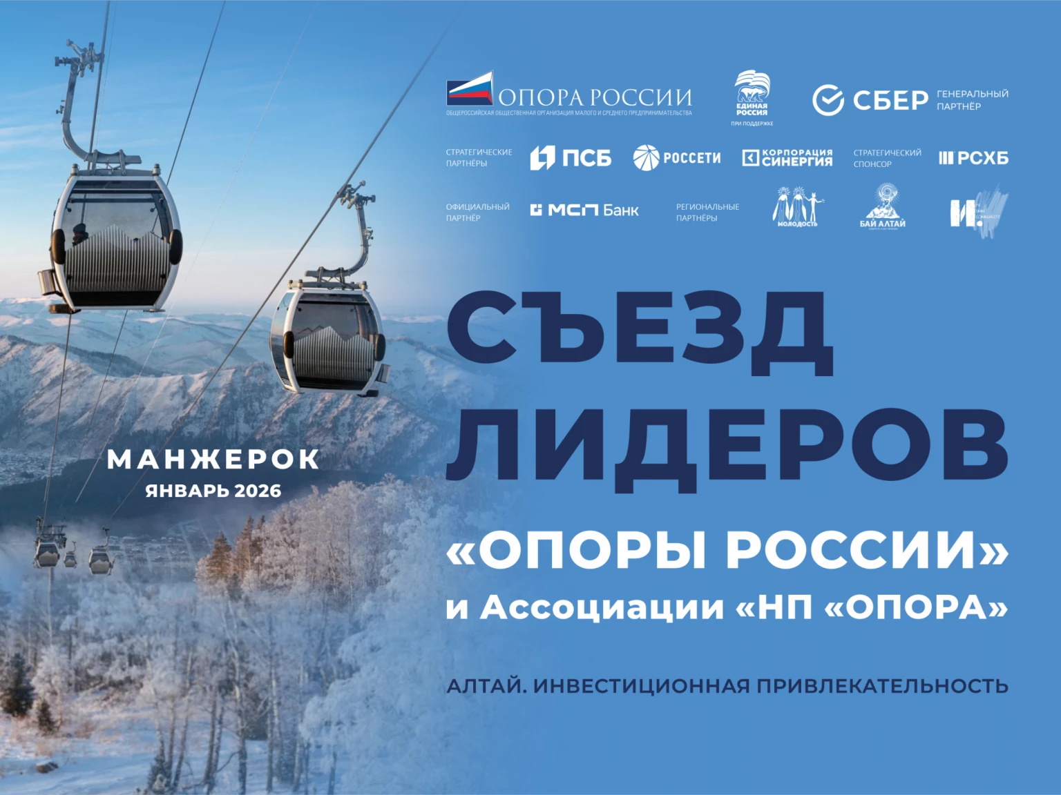 Первый в 2026 году Съезд лидеров «ОПОРЫ РОССИИ» и Ассоциации «НП «ОПОРА» состоится в Республике Алтай с 25 по 27 января. Мероприятие соберет представителей бизнеса, федеральных и региональных органов власти, банковского и экспертного сообществ для обсуждения актуальных вопросов развития предпринимательства, инвестиционной привлекательности региона и внедрения инновационных технологий. К участию в Съезде приглашены Глава Республики Алтай Андрей Турчак и Губернатор Алтайского края Виктор Томенко.