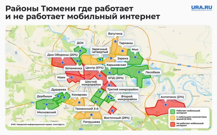 По словам тюменцев, в некоторых микрорайонах, несмотря на ограничения, мобильный интернет есть. В «зеленую» зону попали ДОК, Затюменка, Мыс, Дударева, Европейский, Харьковская, участок Восточного округа и Лесобаза.
