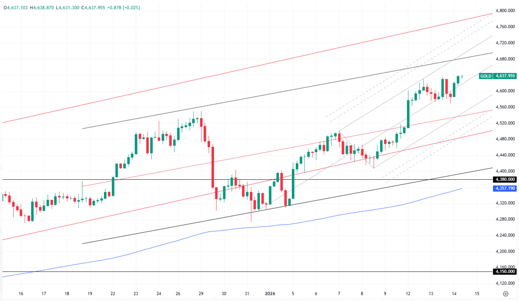 На вчерашних торгах цена на золото незначительно снизилась на 0,3%. На торговой сессии в среду рост возобновился и к настоящему времени цена находится вблизи отметки $4635 за тройскую унцию.