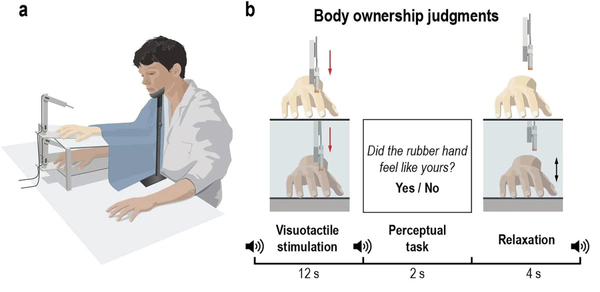 Авторы исследования, опубликованного в журнале Nature Communications, использовали классическую «иллюзию резиновой руки», автоматизировав ее для точности. Роботизированные манипуляторы наносили ритмичные удары по скрытой настоящей руке участника и по лежащему на виду резиновому протезу. Ученые меняли задержку между ударами с точностью до миллисекунд, фиксируя момент, когда человек переставал считать резиновую руку своей.