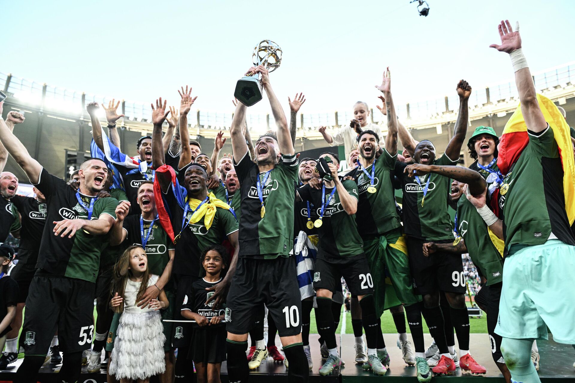 Игроки (Краснодар) радуются победе в чемпионате российской Премьер-лиги по футболу.