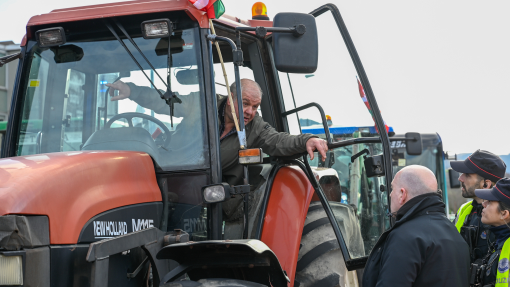 В акции протеста участвуют примерно 200 фермеров из обеих стран. Они прибыли на 108 тракторах.