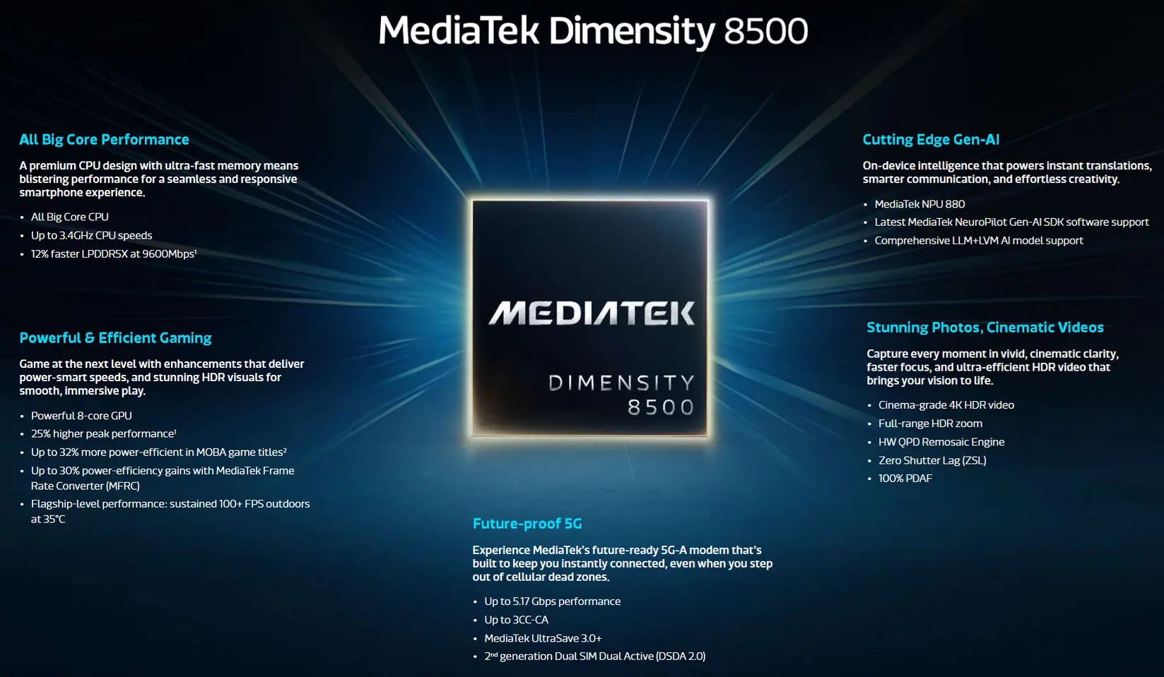 Процессор Dimensity 8500 предназначен для премиального сегмента. Его производят по 4-нанометровой технологии. Архитектура CPU также состоит из восьми высокопроизводительных ядер, но модели Cortex-A725. Максимальная тактовая частота этих ядер составляет 3,4 ГГц. Чип поддерживает оперативную память типа LPDDR5X со скоростью до 9600 Мбит/с. Графическая подсистема представлена процессором Mali-G720. По заявлениям MediaTek, этот GPU обеспечивает на 25% более высокую пиковую производительность и на 20% меньшее энергопотребление по сравнению с предыдущим поколением. В этом процессоре также реализована поддержка трассировки лучей, что делает эту технологию доступной для более широкого круга устройств.