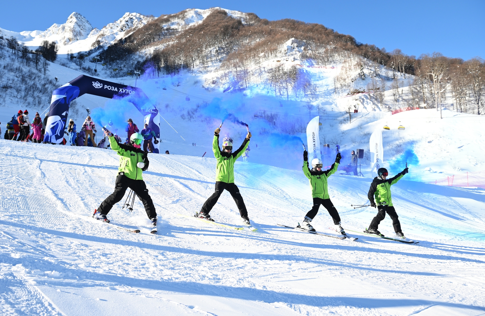 - Праздничный спуск в стиле олдскул на трассе горнолыжного курорта «Роза Хутор» в Сочи