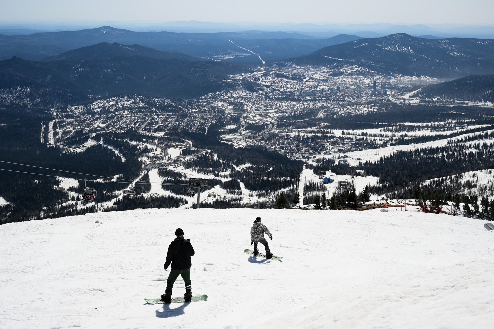 - Туристы на горнолыжном курорте в посёлке Шерегеш в Кемеровской области