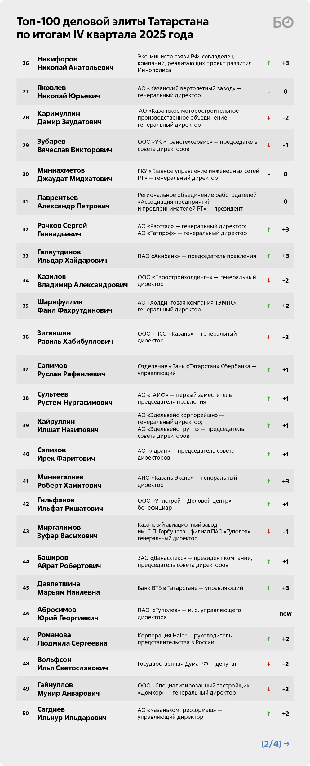 По итогам IV квартала 2025 года в лидеры топ-100 деловой элиты РТ после нескольких падений вырывается гендиректор ПАО «КАМАЗ» Сергей Когогин. В декабре в Кремле он получил из рук президента РФ Владимира Путина звание Героя Труда России за особые трудовые заслуги перед государством и народом. Таким образом Когогину и заводу послан сигнал поддержки несмотря на то, что финансовые показатели автогиганта уже не первый квартал стремятся вниз. Так, чистый убыток КАМАЗа по РСБУ за январь – сентябрь 2025-го составил 29,1 млрд рублей, увеличившись в годовом выражении в 7,6 раза. При этом выручка снизилась на 11,2% и оказалась на уровне 203,1 млрд рублей.