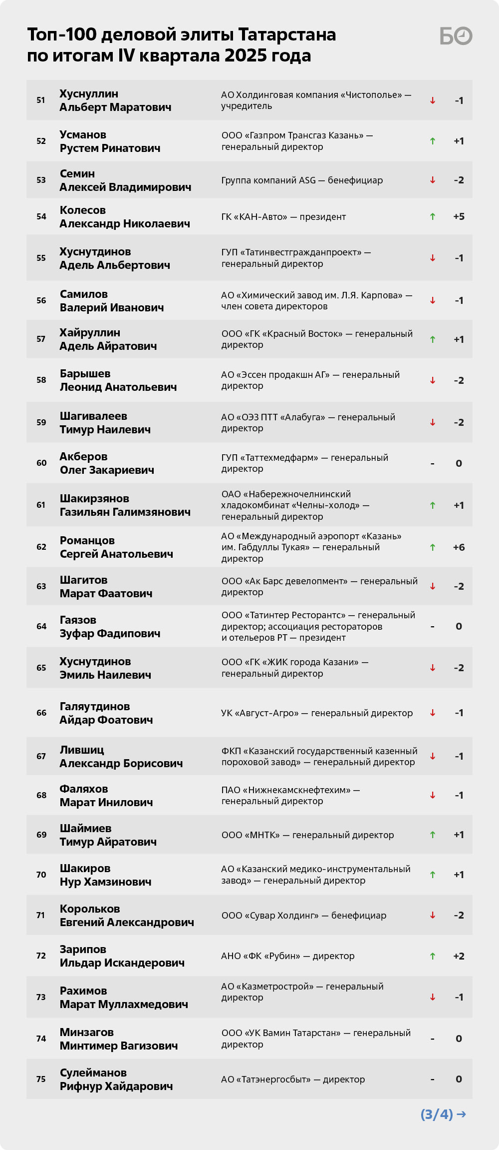 Снижение позиций гендиректора АО «Холдинговая компания „Ак Барс“» Ивана Егорова (3-е место) во многом носит технический характер. В начале 2026-го он готовится отметить 65-летие. А IV квартал 2025 года запомнится для компании скандалом со строительством площадки по выращиванию цыплят-бройлеров на 600 тыс. голов в Кулаевском сельском поселении Пестречинского района. Местных жителей такое соседство не устраивает, они опасаются вони, шума и грязных стоков.