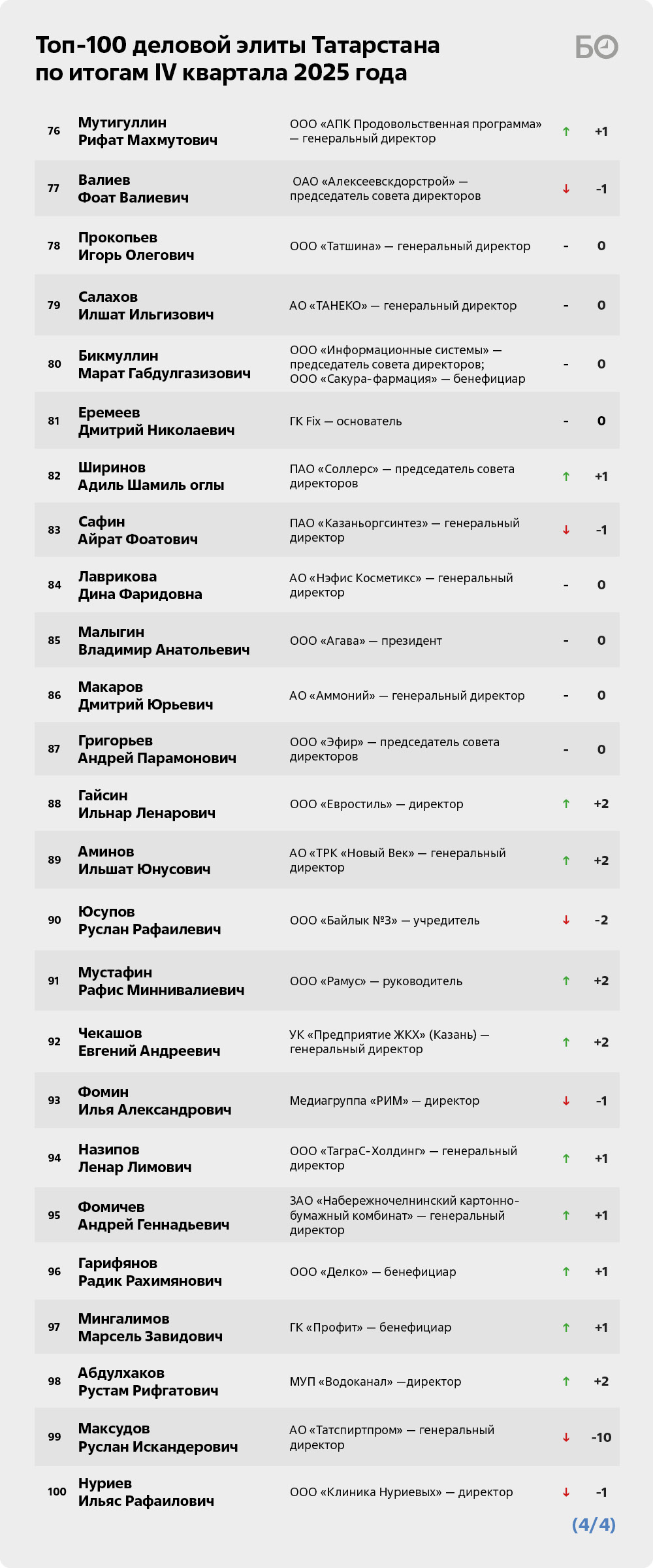 Замыкает топ-100 директор ООО «Клиника Нуриевых» Ильяс Нуриев. Под его руководством ассоциация МСБ Татарстана активизировалась. Например, в начале декабря провели форум малых городов РТ в Елабуге, а еще в октябре в ассоциацию торжественно приняли новых членов. Но, учитывая вступившие в силу с 2026 года налоговые изменения, положение малого бизнеса остается незавидным, а его роль и возможности влиять неуклонно снижаются.