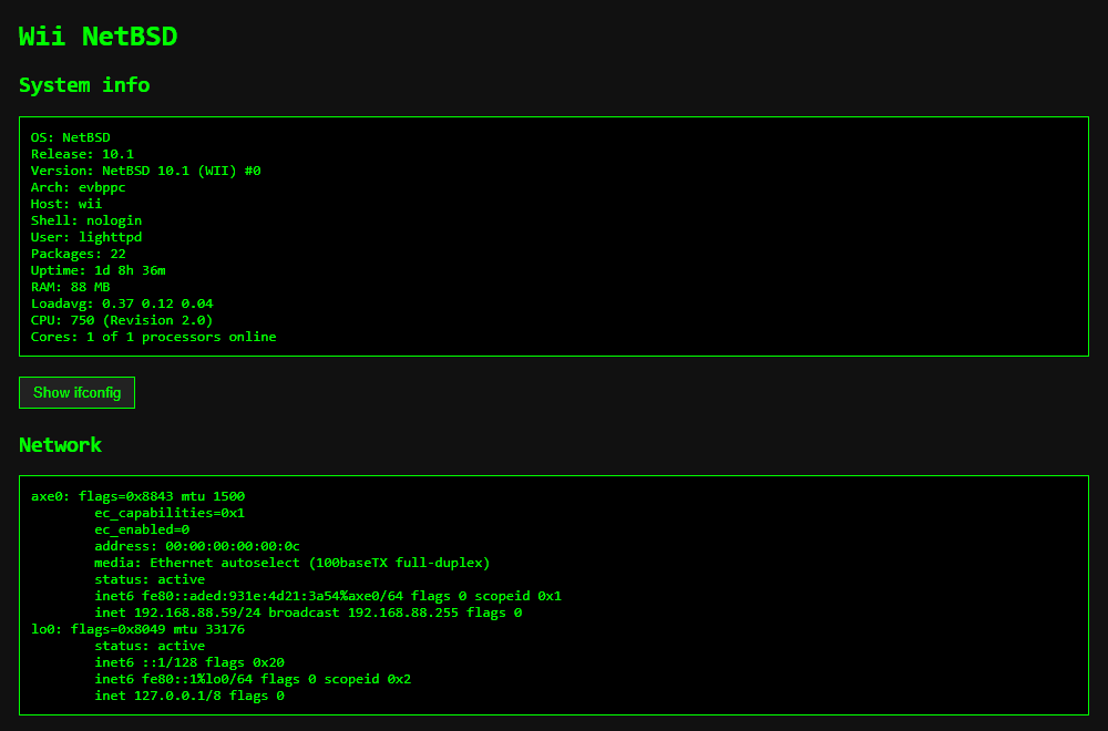 Все это я разумеется захотел попробовать, но наткнулся на информацию из Reddit, что на устройство можно поставить вполне себе актуальную версию NetBSD и она даже будет неплохо работать. Это было максимально интересно, поскольку у Wii скромные характеристики процессора и мало оперативной памяти, всего 88 MB. Да и раньше я, к своему стыду, с этой ОС никогда дела не имел. Решено: ставлю.