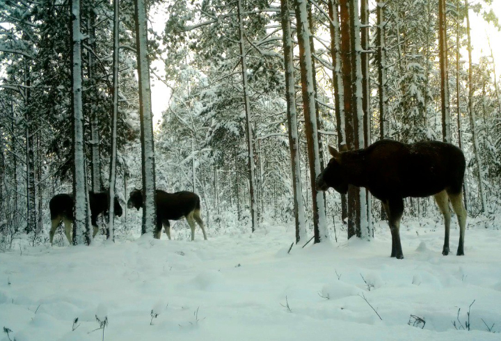 Компания лосей-холостяков попала в видеоловушку Павла Глазкова под Всеволожском. На записи видно, как животные активно общаются с помощью разнообразных звуков. Почти все самцы уже сбросили рога, и только у одного остался последний, который скоро должен отпасть.