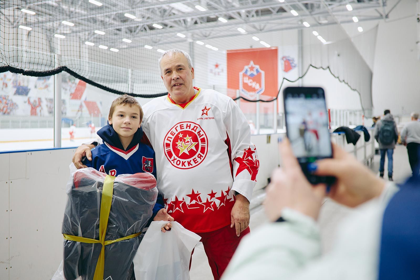 При поддержке клуба «Легенды хоккея» на ледовой арене восемь юных спортсменов получили специальную амуницию для игры. Каждая вещь — от костюма до клюшки — поможет ребятам на пути к их спортивным целям. Подарки вручали мастера спорта, чемпионы мира и олимпийские чемпионы по хоккею, среди которых Владимир Мышкин, Юрий Ляпкин, Александр Якушев, Сергей Бабинов, Вячеслав Анисин, Дмитрий Фролов, Александр Голиков и другие. Легендарные спортсмены пообщались с детьми, дали напутствия и сфотографировались на память.