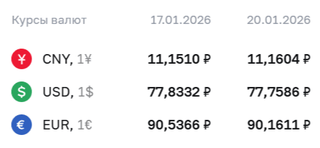- Курс евро снижен до 90,16 рубля, когда на 17 января он составлял 90,53 рубля.