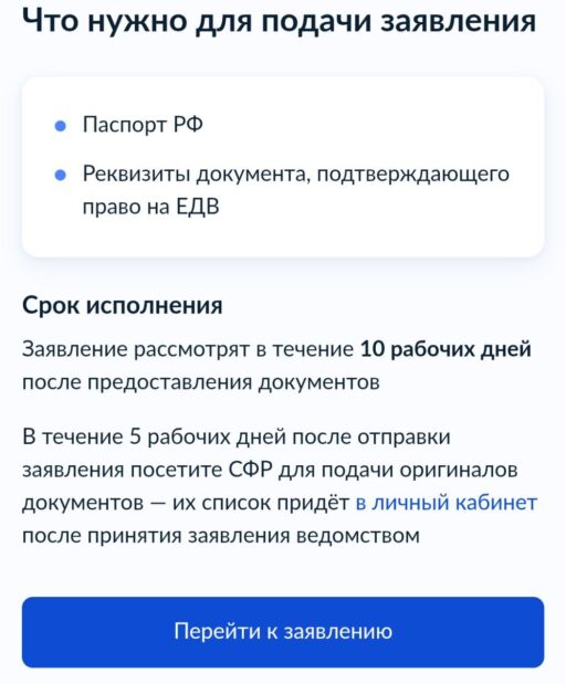 Подать заявление на оформление ЕДВ можно через сайт или местное отделение СФР [4]. Эксперт Манташян напоминает о документах, которые нужно взять с собой: