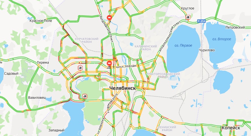 Затор образовался на выезде из Копейска, а также на проспекте Ленина до автодороги Меридиан.
