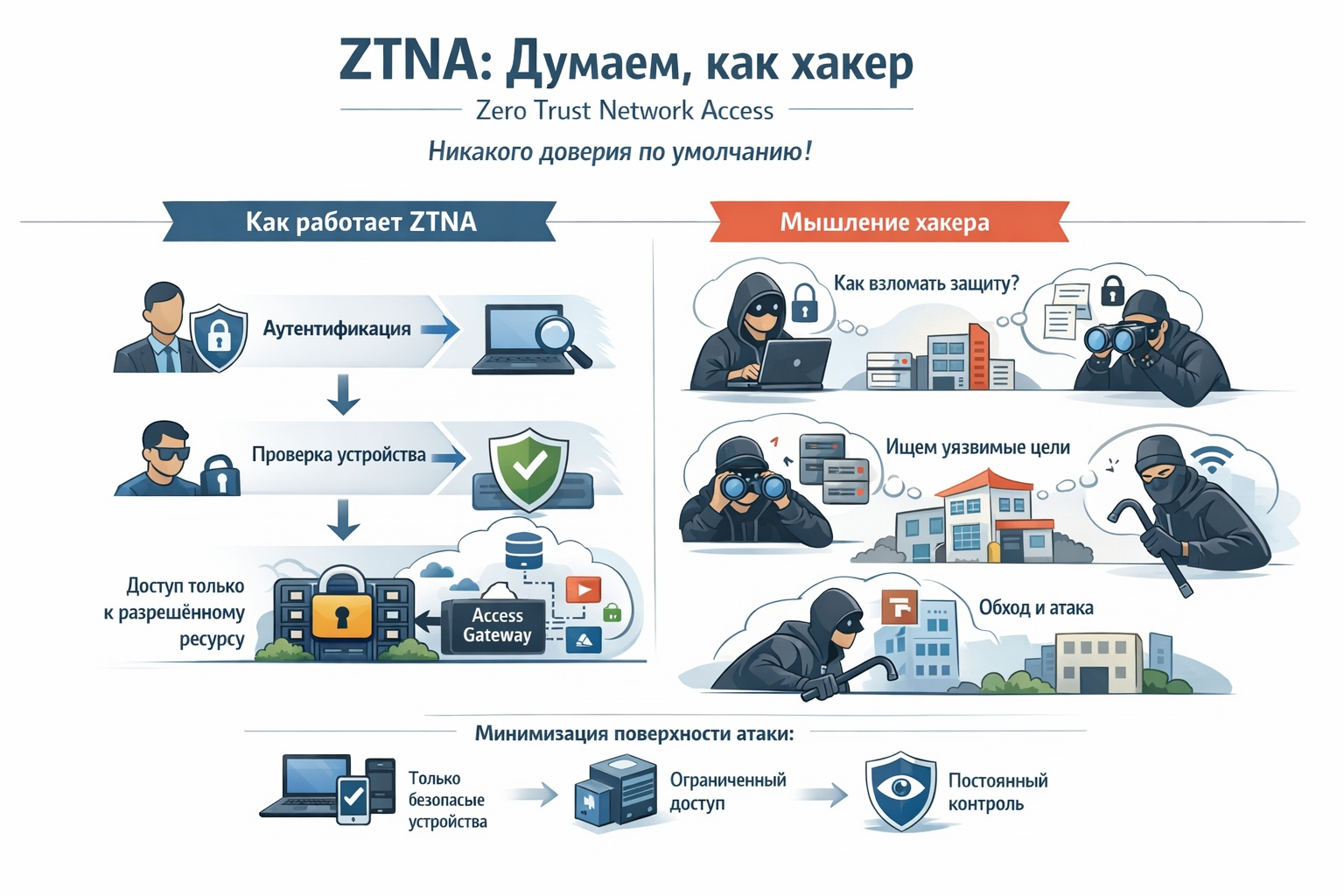 Такой подход очень близок к логике атакующего. Хакер всегда ищет избыточные права, скрытые доверительные связи и места, где контроль «временно отключили ради удобства». ZTNA вынуждает защитников делать то же самое, но заранее и осознанно, пока это не сделал кто-то с другой стороны.