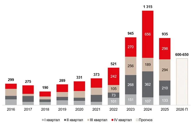 Совокупный объем инвестиций в российскую недвижимость за 2025 год составил 935 млрд рублей — это близко к уровню 2023 года (945 млрд рублей), но на 29% меньше, чем в 2024-м (1,3 млрд рублей). Падение по сравнению с предыдущим годом сигнализирует о стабилизации после периода бурного роста. Тем не менее, рынок по-прежнему значительно активнее докризисных времен: результат 2025 года превышает среднегодовые показатели 2016–2021 годов более чем в три раза, что подчеркивает стойкий интерес инвесторов к недвижимости даже на фоне умеренного экономического роста.