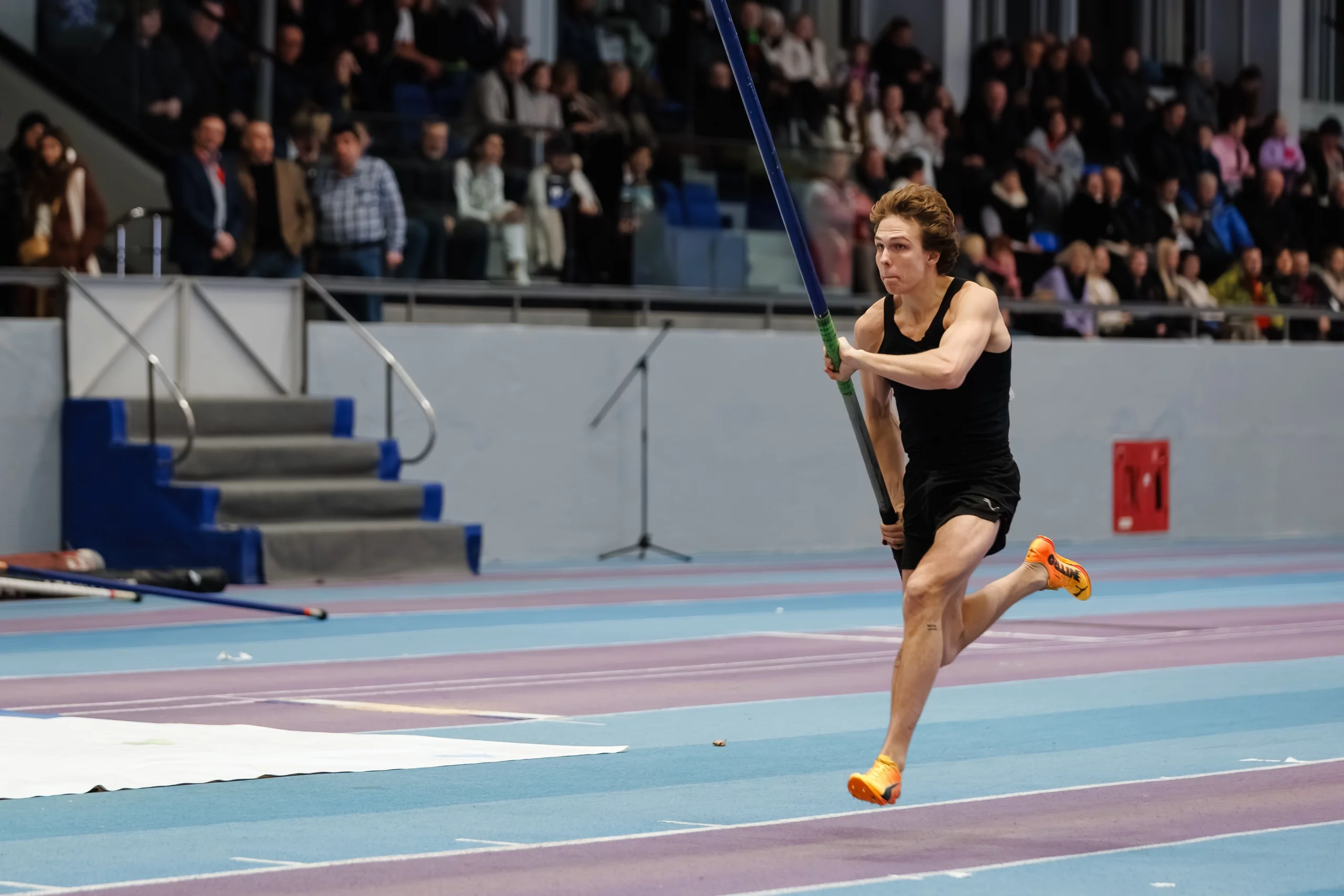 Затем в манеж вышли топовые спортсмены России и Беларуси. В секторе по прыжкам с шестом женщины соревновались наравне с мужчинами с гандикапом 1 метр. Здесь победу праздновал белорусский спортсмен Матвей Волков. Он уверенно преодолевал планку на высотах 5.45, 5.57 и 5.69 м. После одной неудачной попытки на высоте 5.74 м. Матвей перенес оставшиеся прыжки на 5.79 м. И с первой же попытки справился с этим рубежом.