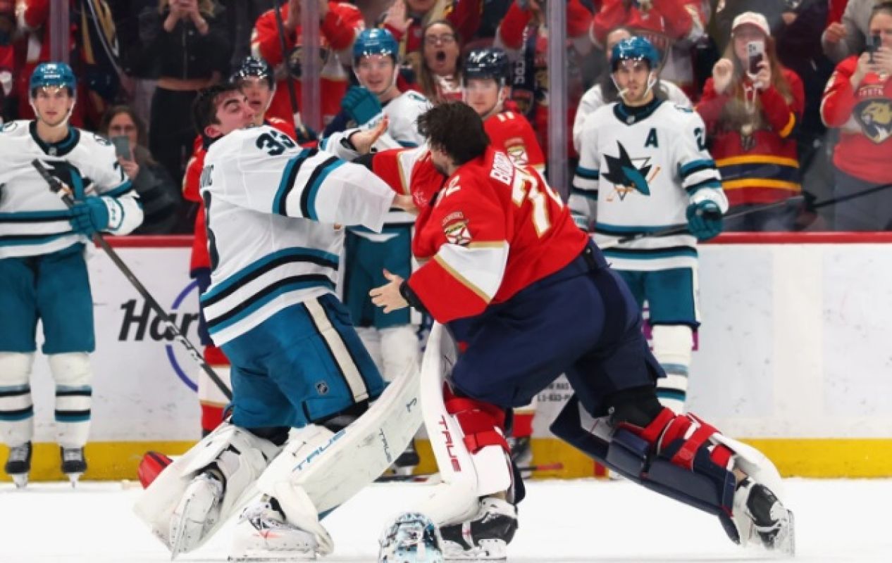 В одном из матчей регулярки НХЛ эмоции внезапно зашкалили так, что досталось даже вратарям. Голкипер «Флориды Пантерз» не выдержал накала и сошелся в кулачном бою с американским стражем ворот «Сан-Хосе Шаркс» Алексом Недельковичем.