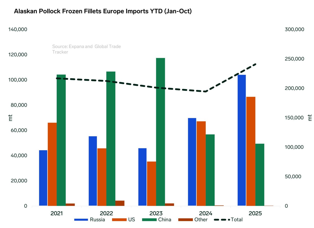 Доминирование трех игроков: Рынок остается высококонцентрированным: на долю России, США и Китая в 2025 году суммарно приходится около 99% всего европейского импорта филе минтая.