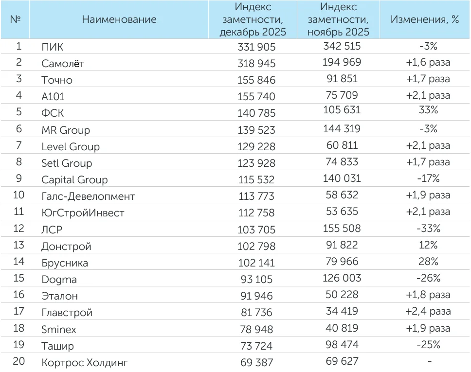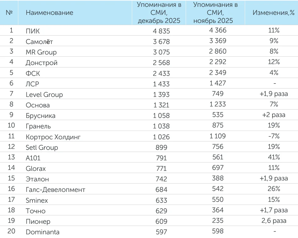 Система мониторинга и анализа СМИ и соцмедиа СКАН-Интерфакс совместно с онлайн-порталом «Строительной газеты» подготовили медиарейтинг девелоперских компаний за 2025 год. ГК ПИК в прошлом году заняла первое место по количеству упоминаний и индексу заметности, третье место по охвату аудитории. ГК «Самолет» заняла второе место по количеству упоминаний и «заметности» компании в СМИ, первое место по охвату аудитории. На третьем месте по индексу заметности и на втором месте по аудиторному охвату расположилась ГК «Ташир». На третьем месте по количеству упоминаний – MR Group.