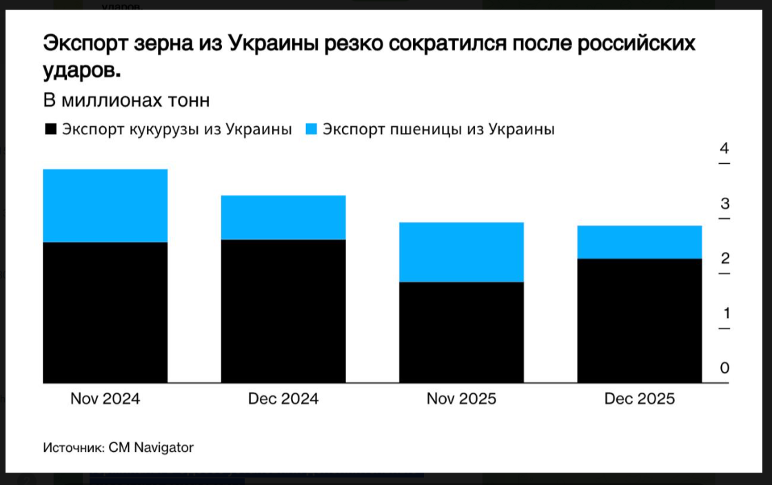 Стоит отметить, что экспорт зерна в декабре упал на 16% после усиления атак России на портовую инфраструктуру. Соответствующую информацию ранее приводило агентство Bloomberg. Экспорт пшеницы снизился почти на 25%, кукурузы - на 13% по сравнению с декабрём 2024 года.