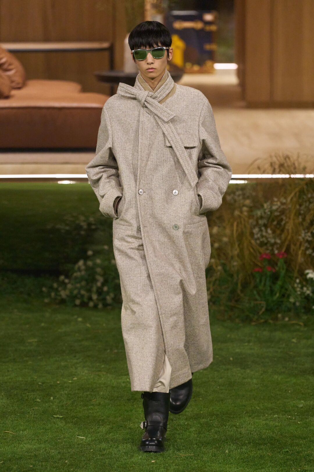 Это могла бы быть выставка Salone del Mobile, но мы все еще в парижском LV Foundation: на этот раз Фаррелл Уильямс превратил подиум в сборный дом со стеклянными стенами, спроектированный в сотрудничестве с архитектурной фирмой Not a Hotel. На шоу провозгласил эру таймлесс-классики (только ремесленничество, только хардкор!): делает ставку на вневременные денди-двойки (финансовый кризис — ин, хайп и эксперименты — аут!), устраивая марьяж костюмных ретро-силуэтов и инновационных хайтек-материалов. Например, мятая куртка-харрингтон соткана с использованием алюминиевой нити, шелковые парки дополнены водоотталкивающими мембранами, а клеткокорные костюмы сшиты из светоотражающей ткани.
