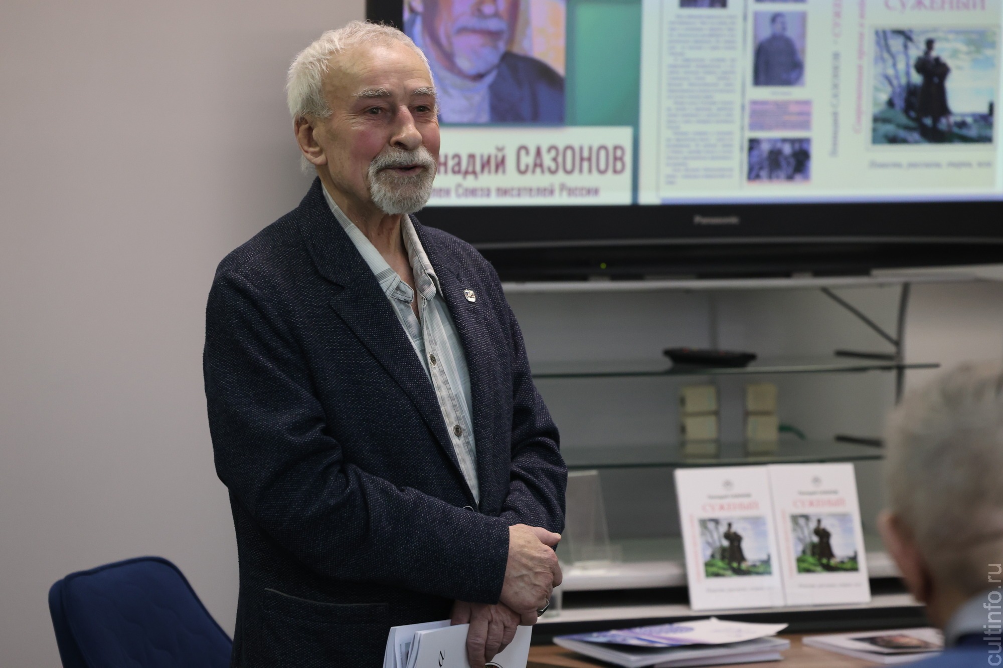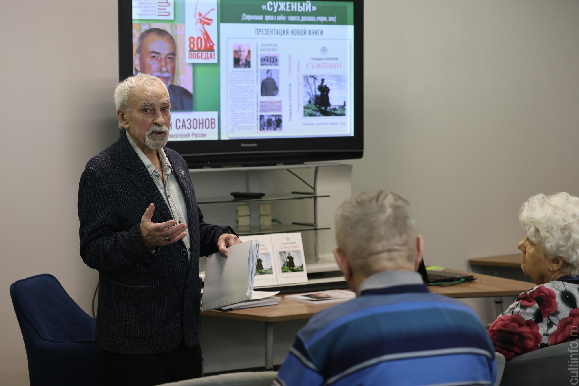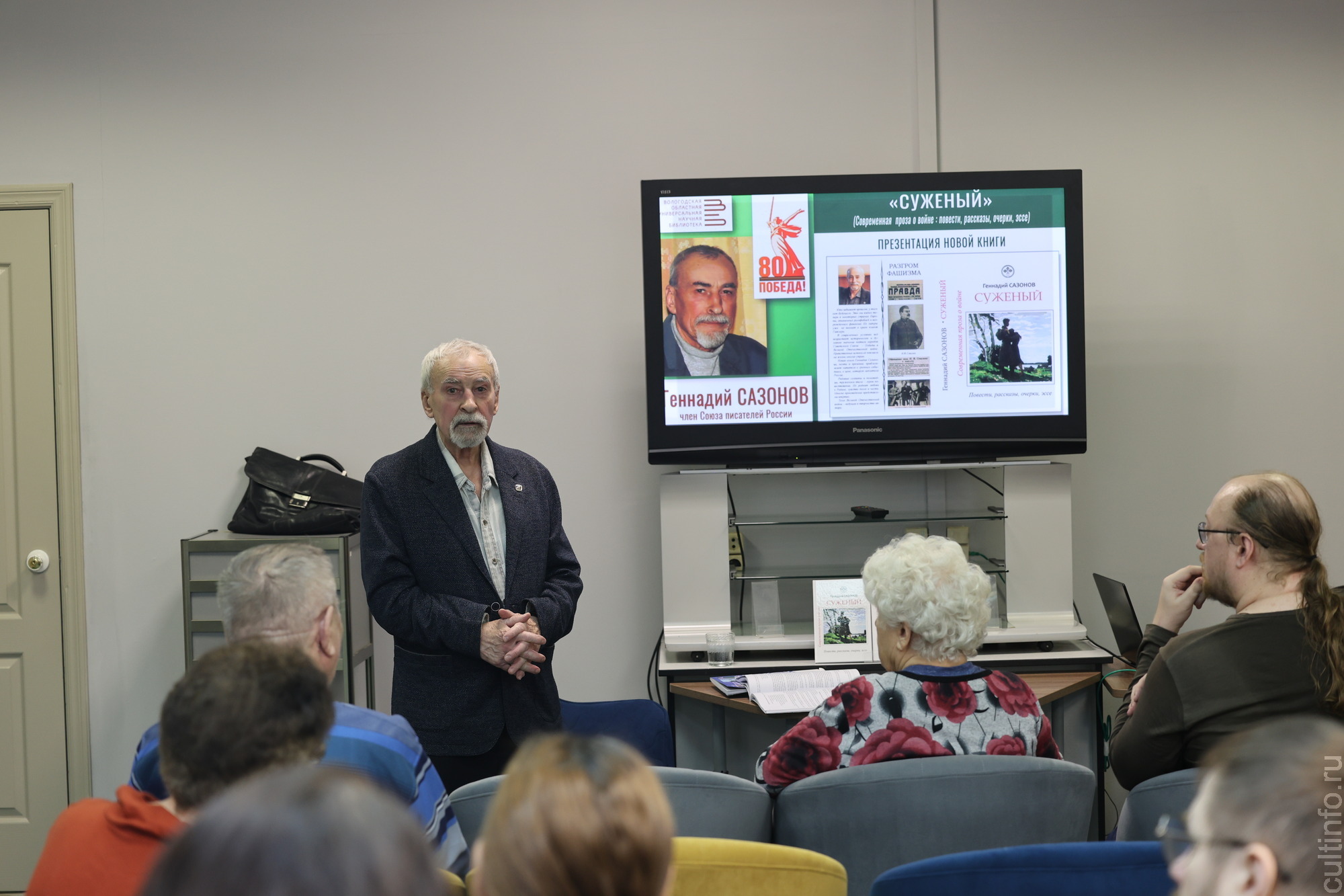 Первая презентация книги «Суженый» вологодского писателя, поэта и публициста Геннадия Сазонова состоялась в областной библиотеке. В издание вошли повести, рассказы, очерки и эссе, основанные на воспоминаниях участников Великой Отечественной войны. Герои произведений – рядовые солдаты, командиры и труженики тыла, которых объединяет любовь к Родине. Книга вышла в издательстве «Интелинформ» в прошлом году к 80-летию Победы, тираж составил 500 экземпляров.