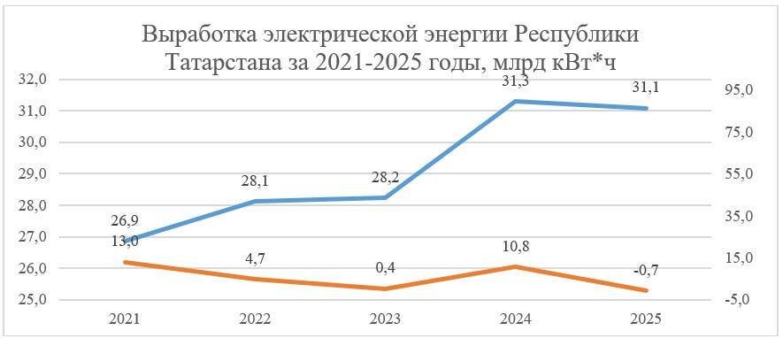 Татарстан остается избыточным по установленной и располагаемой мощности генерации, но при этом часть электроэнергии региональная энергосистема покупает на федеральном оптовом рынке. Так, в 2025 году при выработке 31,088 млрд кВт⋅ч сальдо-переток в энергосистему вырос на 57%, или на 2,14 млрд кВт⋅ч, составив 5,9 млрд кВт⋅ч.