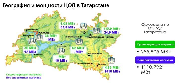 Сейчас в Татарстане 18 ЦОДов с совокупной мощностью потребления 256 МВт. Крупные объекты работают в Иннополисе, Казани, Набережных Челнах, Нижнекамске, Елабуге и Бугульме. Поскольку «Системный оператор» отвечает за планирование развития электроэнергетики, то мы знаем, что перспективная нагрузка, которая может появиться буквально в ближайшие два года, уже более 1100 МВт. Это семь проектов в Казанском, Бугульминском, Набережночелнинском, Чистопольском, Елабужском районах.