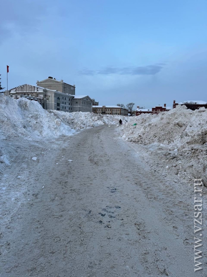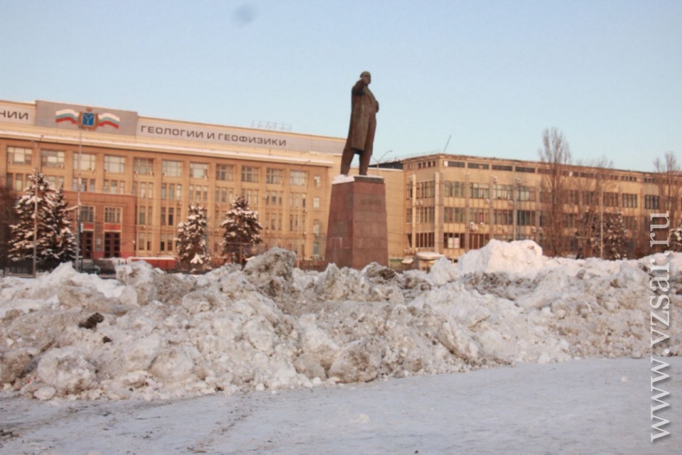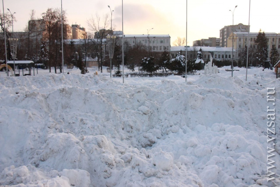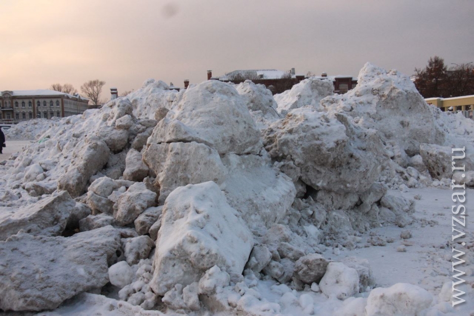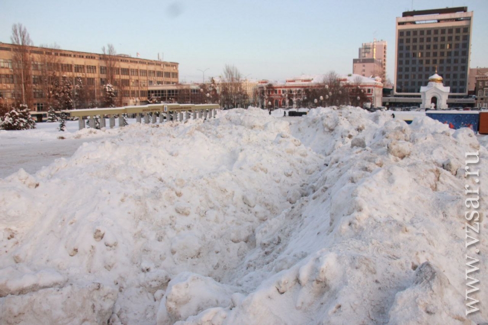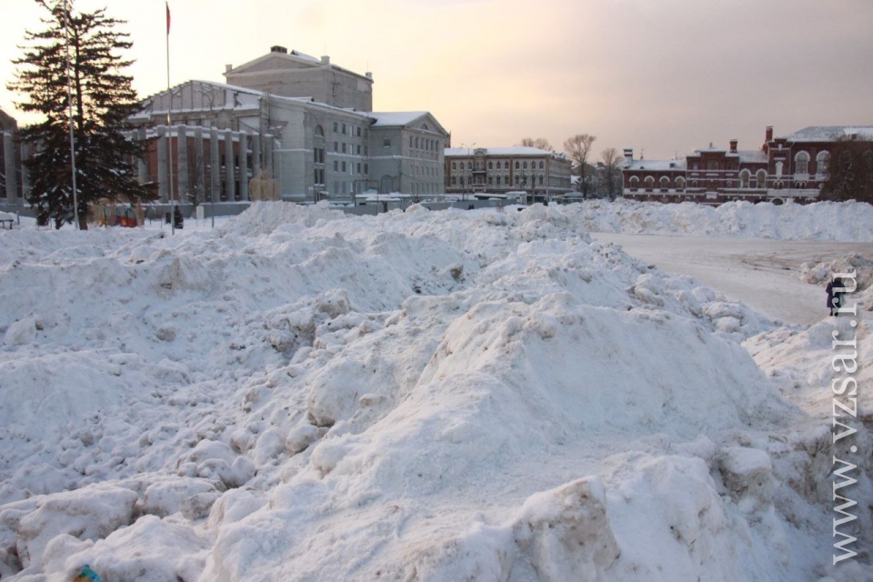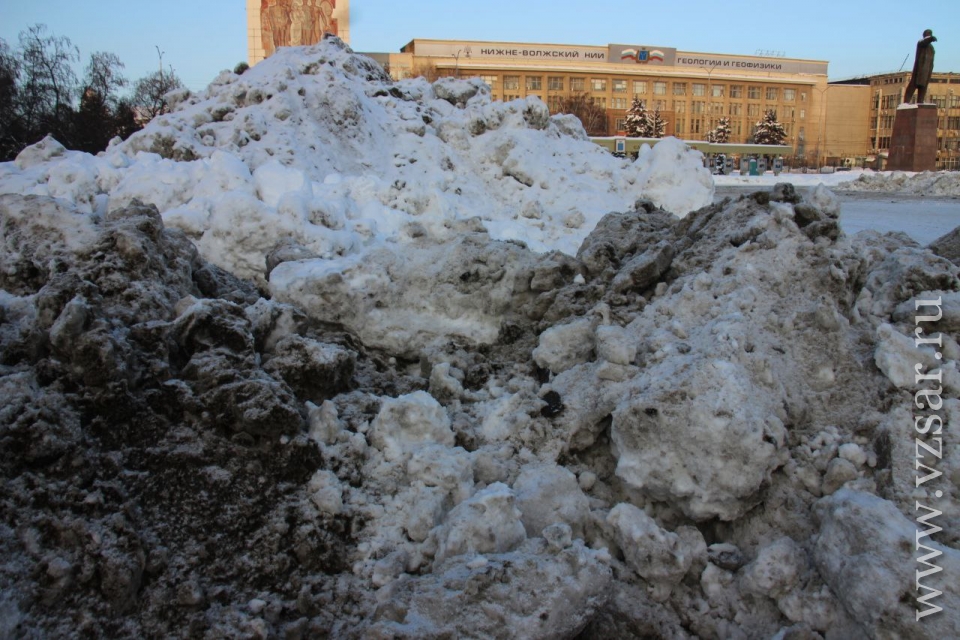Театральную площадь Саратова превратили в место хранения грязного снега, свозимого с городских улиц. Об этом сообщает корреспондент ИА "Взгляд-инфо", побывавший на месте.