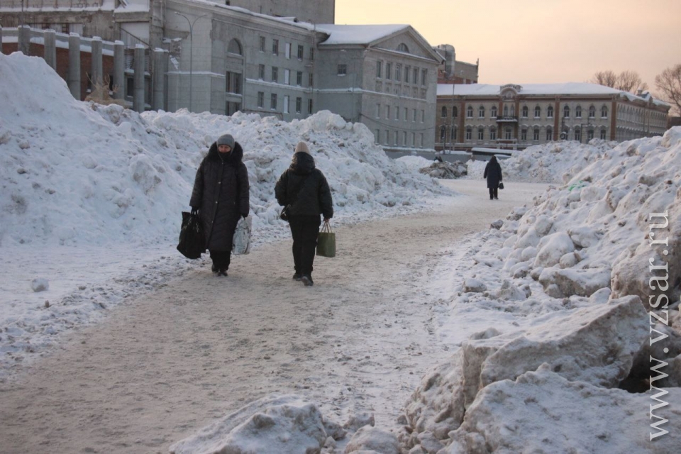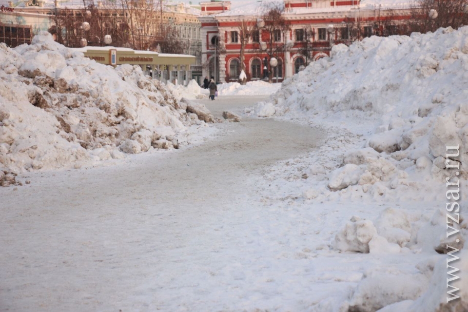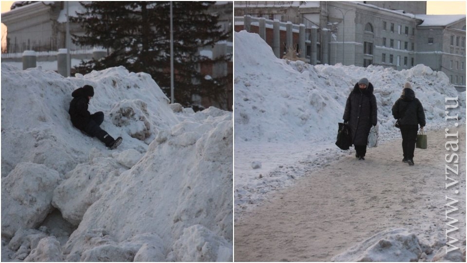 "На площади образовались большие снежные горы. При этом они ничем не огорожены, из-за чего дети спокойно гуляют по вершинам, рискуя свалиться вниз. Пешеходы обходят грязные кучи стороной по узкому коридору, то и дело опасливо озираясь по сторонам", - рассказал наш коллега.