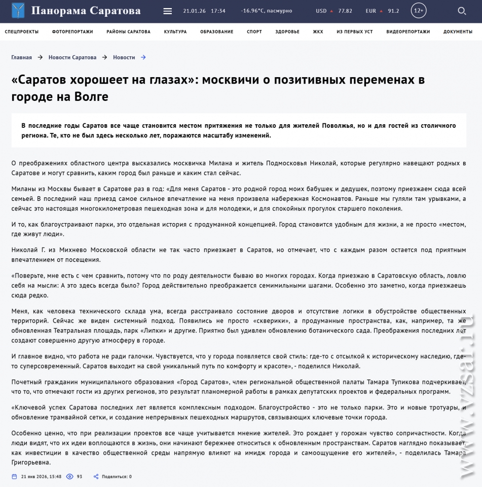 В частности, СМИ муниципалитета приводит мнение некого "Николая Г. из Михнево Московской области", который "не так часто приезжает в Саратов, но отмечает, что с каждым разом остается под приятным впечатлением от посещения".