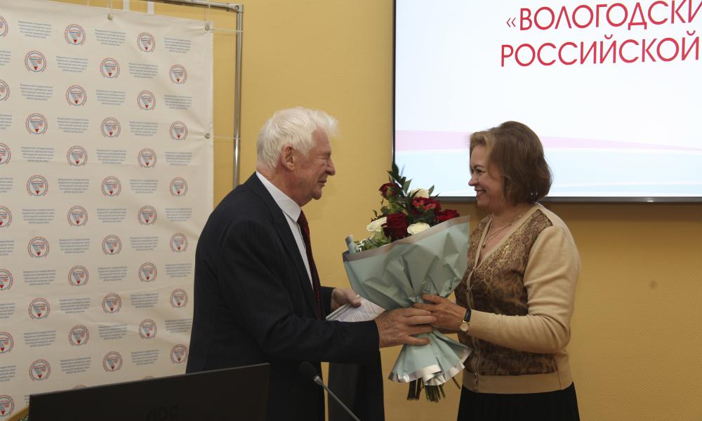 Заместитель министра образования Вологодской области Л.В. Святышева вручила поздравительный адрес от Правительства Вологодской области и медаль от Министерства науки и высшего образования РФ «За вклад в реализацию государственной политики в области образования и научно-технологического развития» (Приказ от 11.08.2025 № 625 к/н).