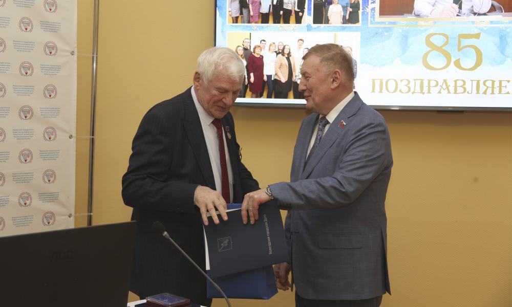 19 января 2026 года состоялось заседание Объединенного ученого совета ФГБУН ВолНЦ РАН, посвященное 85-летию научного руководителя Центра, члена-корреспондента РАН В.А. Ильина. Доклад «В каком государстве хотят жить россияне? Какое государство построено?», подготовленный В.А. Ильиным, позволил озвучить некоторые результаты долгосрочного мониторинга эффективности государственного управления, который ведется ФГБУН ВолНЦ РАН с середины 1990-х гг. и включает в себя, в том числе, комплексный социологический мониторинг состояния общества: оценки населения относительно положения дел в стране, деятельности органов власти всех уровней публичной системы государственного управления, своего психологического состояния, восприятия динамики уровня и качества жизни и многие другие аспекты. В ходе заседания со словами поздравления выступили представители органов власти и научного сообщества. В.А. Ильин был награжден медалями от Министерства науки и высшего образования РФ «За вклад в реализацию государственной политики в области образования и научно-технологического развития» и Общественной палаты Вологодской области «За заслуги перед обществом».