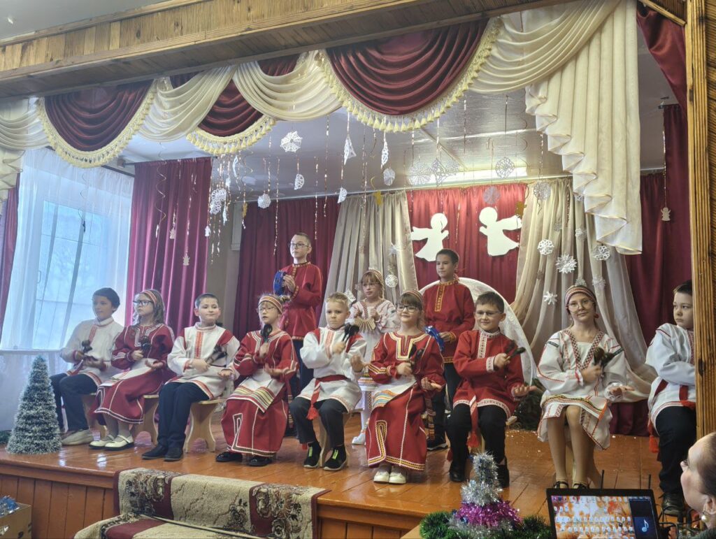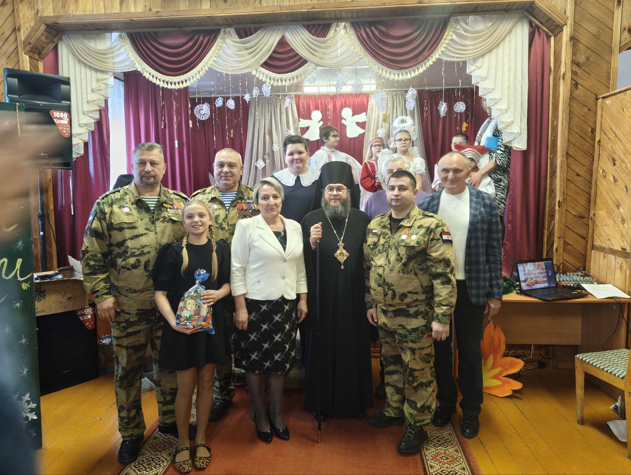 Школьники подготовили красочное представление о чуде рождества, пели, читали стихи, играли на ложках и танцевали. Суровые сильные мужчины, вернувшиеся со специальной военной операции, были очень растроганы простыми песнями и стихами, провучавшими из уст детей.