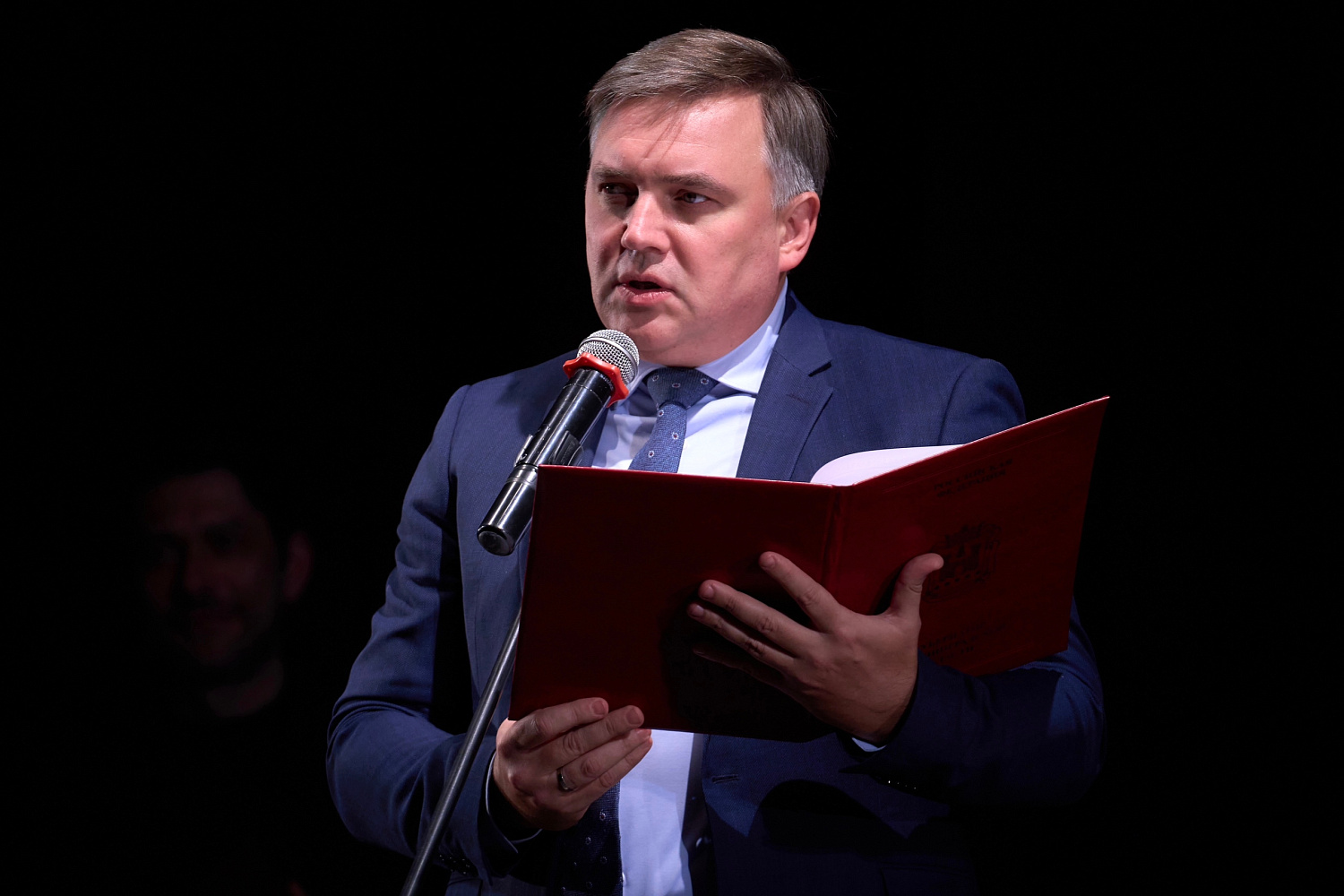 Торжественная часть продолжилась вручением наград и выступлением министра по культуре и туризму Калининградской области Андрея Викторовича Ермака, который также поздравил калининградское отделение СТД РФ с юбилеем и зачитал Поздравительный адрес от главы региона Алексея Сергеевича Беспрозванных.