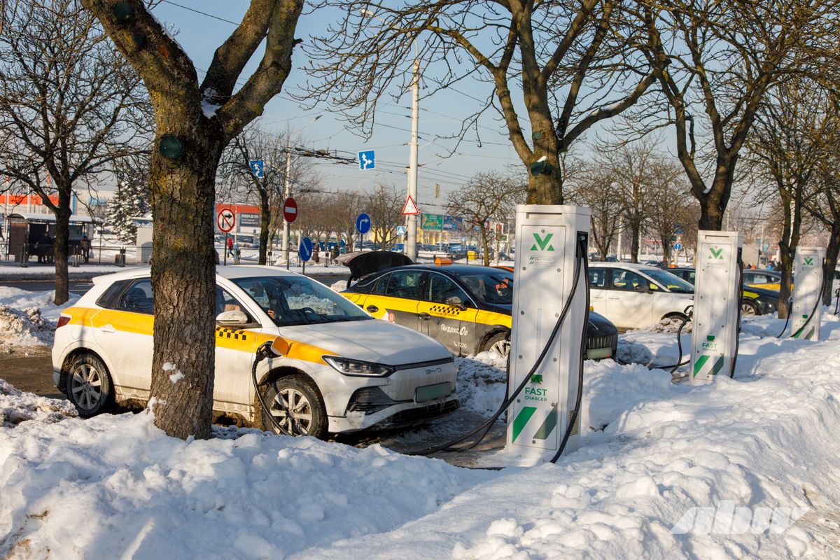Первая зарядка на маршруте – на улице Заславской. Кажется, там в любое время много таксистов, а свободное место на зарядке найти не так просто. Кстати, в приложении Malanka было указано, что несколько столбиков на 50 кВт находятся на ремонте и возобновят работу ориентировочно 15 января. Вот только на месте – неработающие столбики на 120 кВт, а на календаре на момент съемки – 20-е число. Место возле нефункционирующих зарядок не расчищено. Логично: убрать снег можно, а зачем, если зарядка нерабочая?