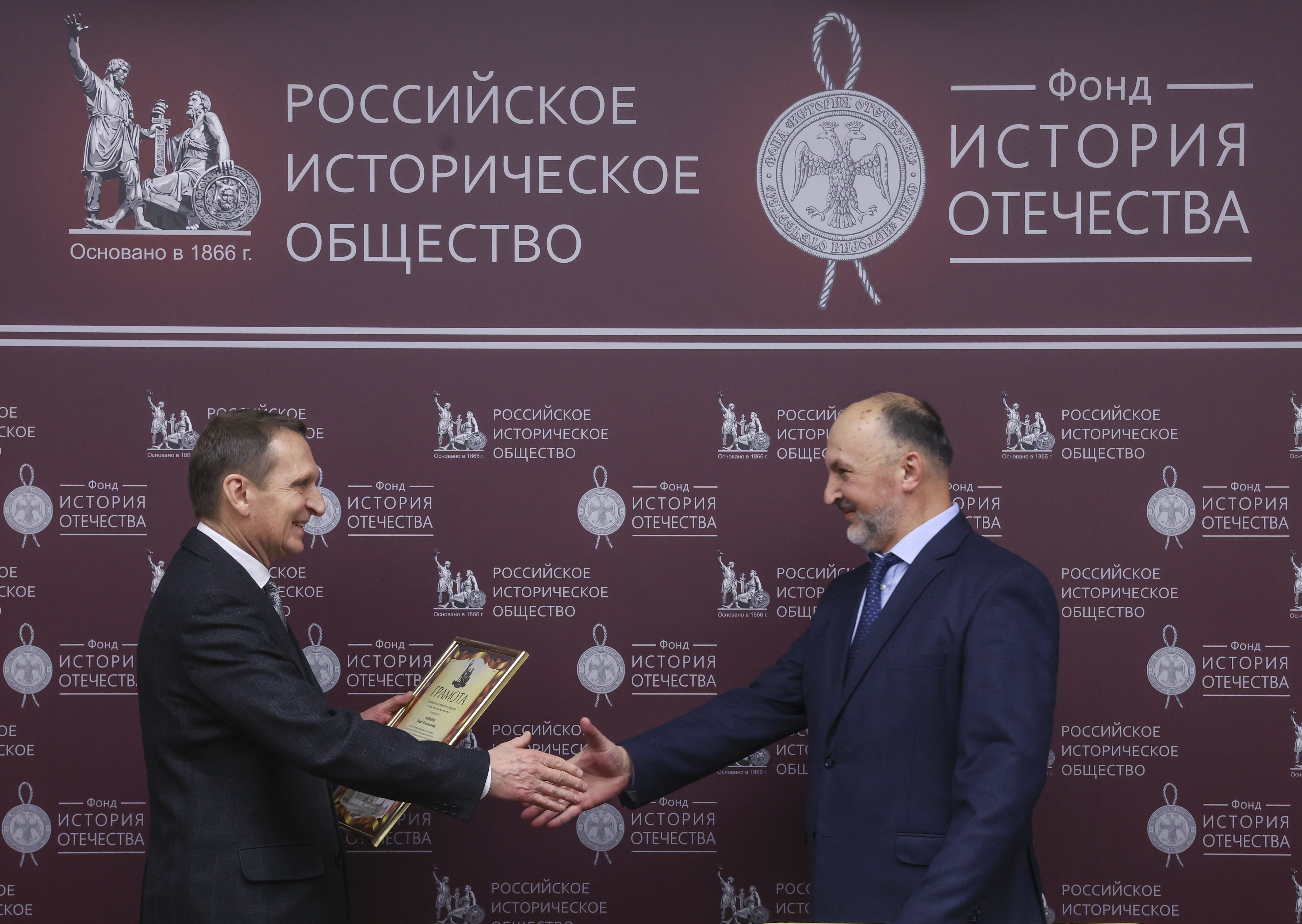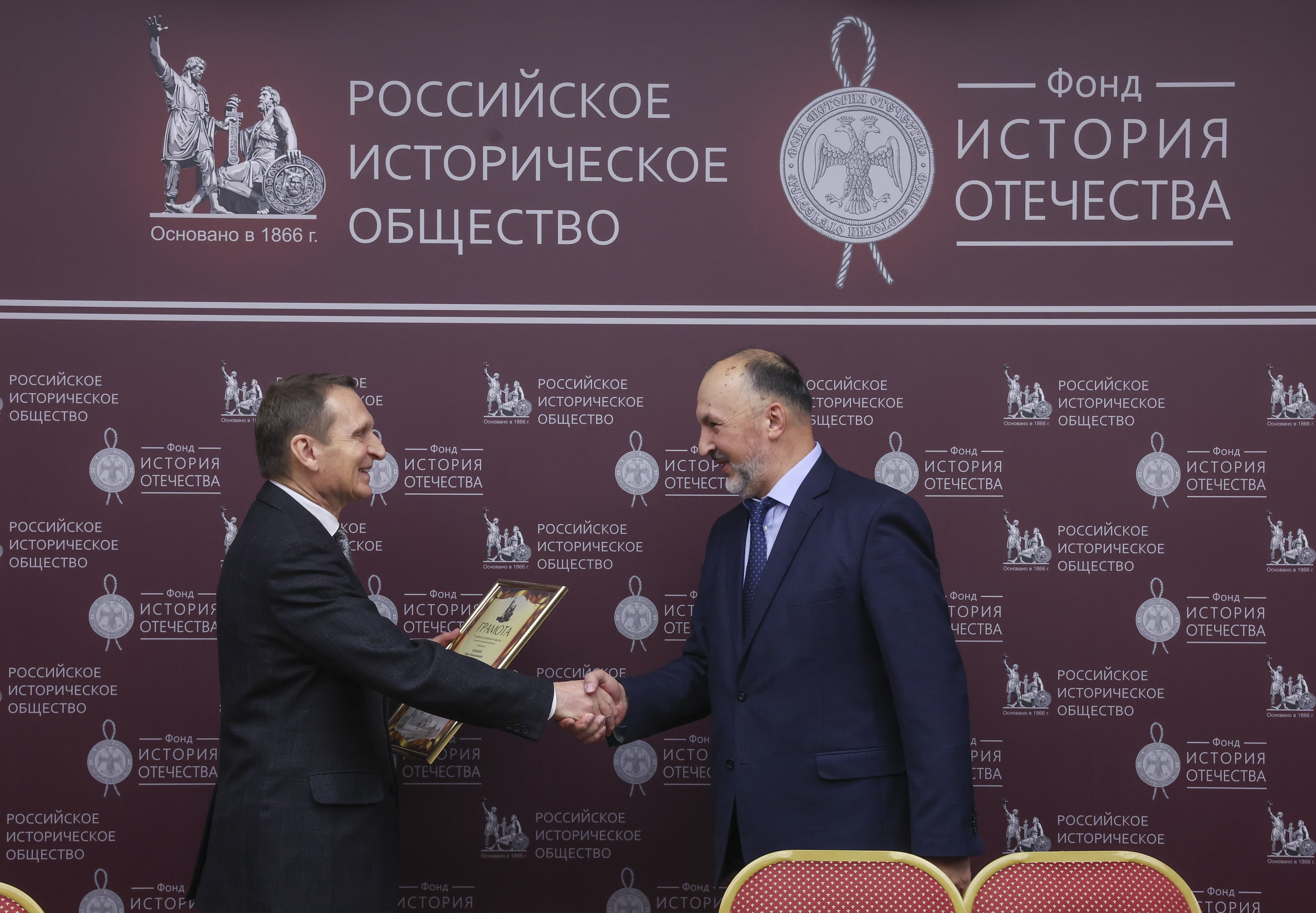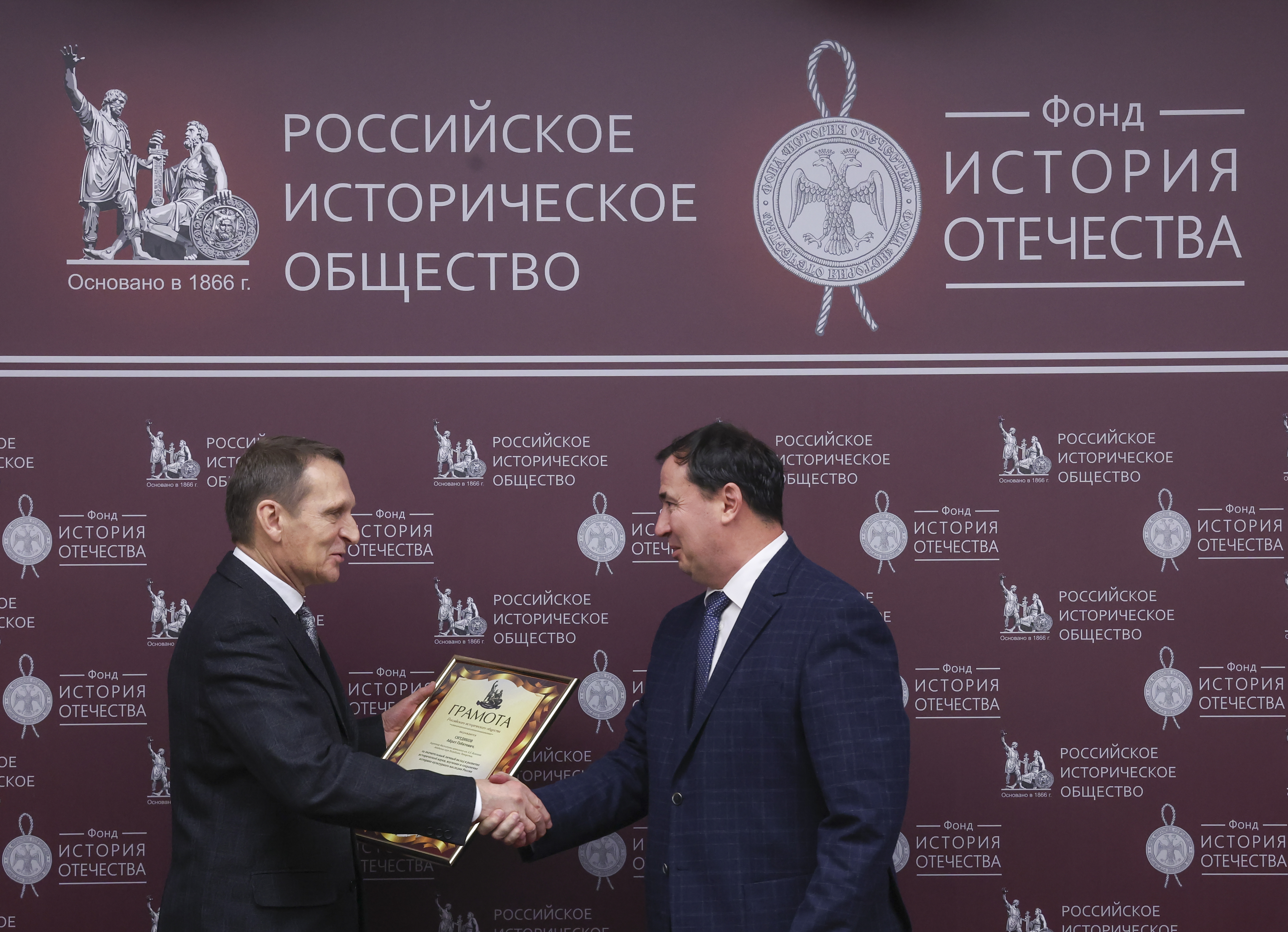 По завершении круглого стола Сергей Нарышкин вручил нескольким участникам дискуссии грамоты Российского исторического общества. Награды за значительный вклад в историческое просвещение и развитие исторической науки получили директор Центрального музея Вооружённых сил Российской Федерации Александр Никонов, председатель Совета отделения РИО в Республике Башкортостан, директор Центра гуманитарных исследований Министерства культуры Республики Башкортостан Марат Марданов и директор Института археологии имени А.Х. Халикова Академии наук Республики Татарстан Айрат Ситдиков.