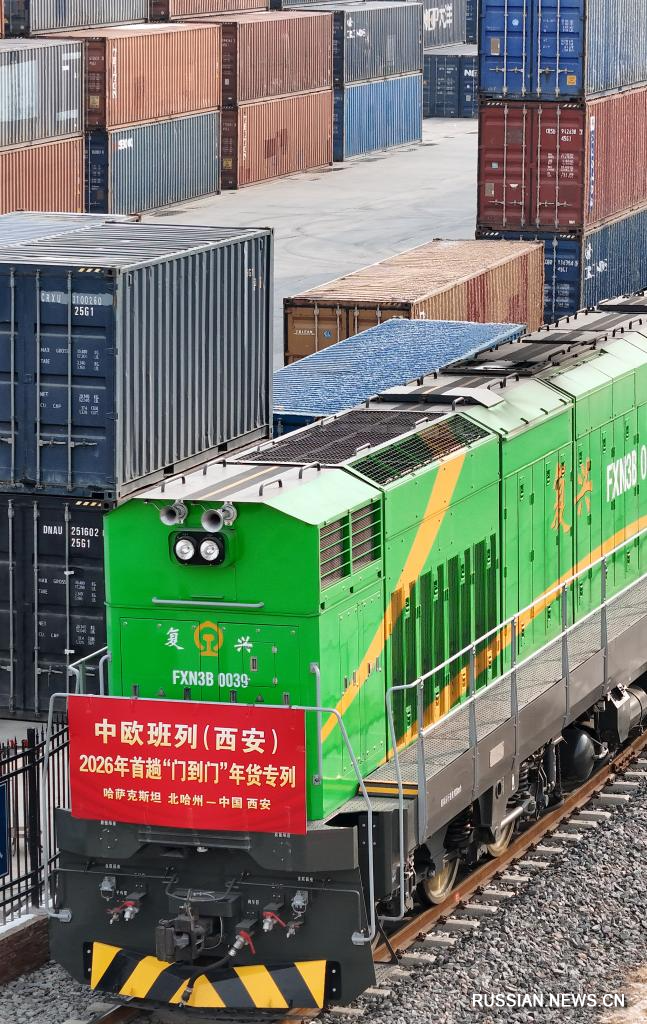 21 января 2026 года, первый в 2026 году специальный грузовой поезд Китай-Европа, груженный праздничными товарами, посвященными празднику Весны /Чуньцзе, традиционный китайский Новый год по лунному календарю/, прибыл в Сианьский международный порт "Чаньба". /Фото: Синьхуа/