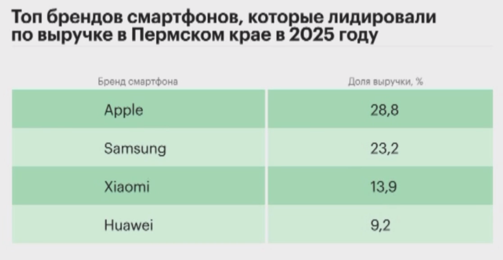 Что касается стоимости смартфонов, то она выросла на 10-15% в 2025 году по сравнению с 2024, рассказал управляющий магазина «Гаджет маркет» Антон Потеряев. По его словам, средняя цена телефона сейчас составляет примерно 50 тыс. руб. Самая высокая стоимость, как и прежде, остаётся у техники Apple, что, согласно аналитике МТС, позволяет бренду сохранять лидерство по выручке в Прикамье. Второе и третье места по этому показателю занимают Samsung и Xiaomi.