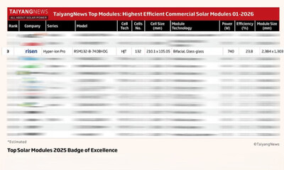 Недавно глобальный авторитетный источник в области фотоэлектрических систем TaiyangNews опубликовал свой первый список ЛУЧШИХ СОЛНЕЧНЫХ МОДУЛЕЙ 2026 года. Модули Hyper-ion Pro HJT компании Risen Energy заняли место в тройке мировых лидеров за счет номинальной пиковой мощности модулей массового производства 740 Вт и эффективности преобразования энергии 23,8 %.