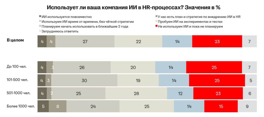 В HR-процессах технологии искусственного интеллекта используют 57% работодателей, однако пока эта практика далека от системной. Так, лишь 4% компаний сообщили, что ИИ в кадровых процессах применяется повсеместно. Еще 27% признали, что подключают ИИ-инструменты к работе с персоналом время от времени, без четкой стратегии. При этом наиболее часто ИИ для решения HR-задач применяют компании со штатом от тысячи человек (62%), а наиболее редко — со штатом в пределах ста человек (53%).