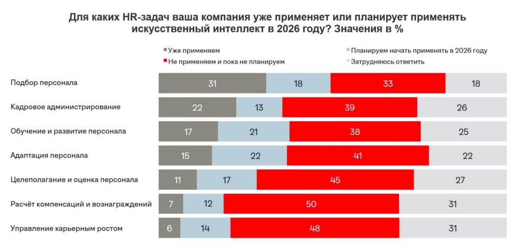Чуть меньше сомнений работодатели испытывают относительно интеграции ИИ-технологий в управление карьерным ростом сотрудников. Пока такие примеры есть только в 6% компаний, но в 2026 году к ним намерены присоединиться еще 14% респондентов.