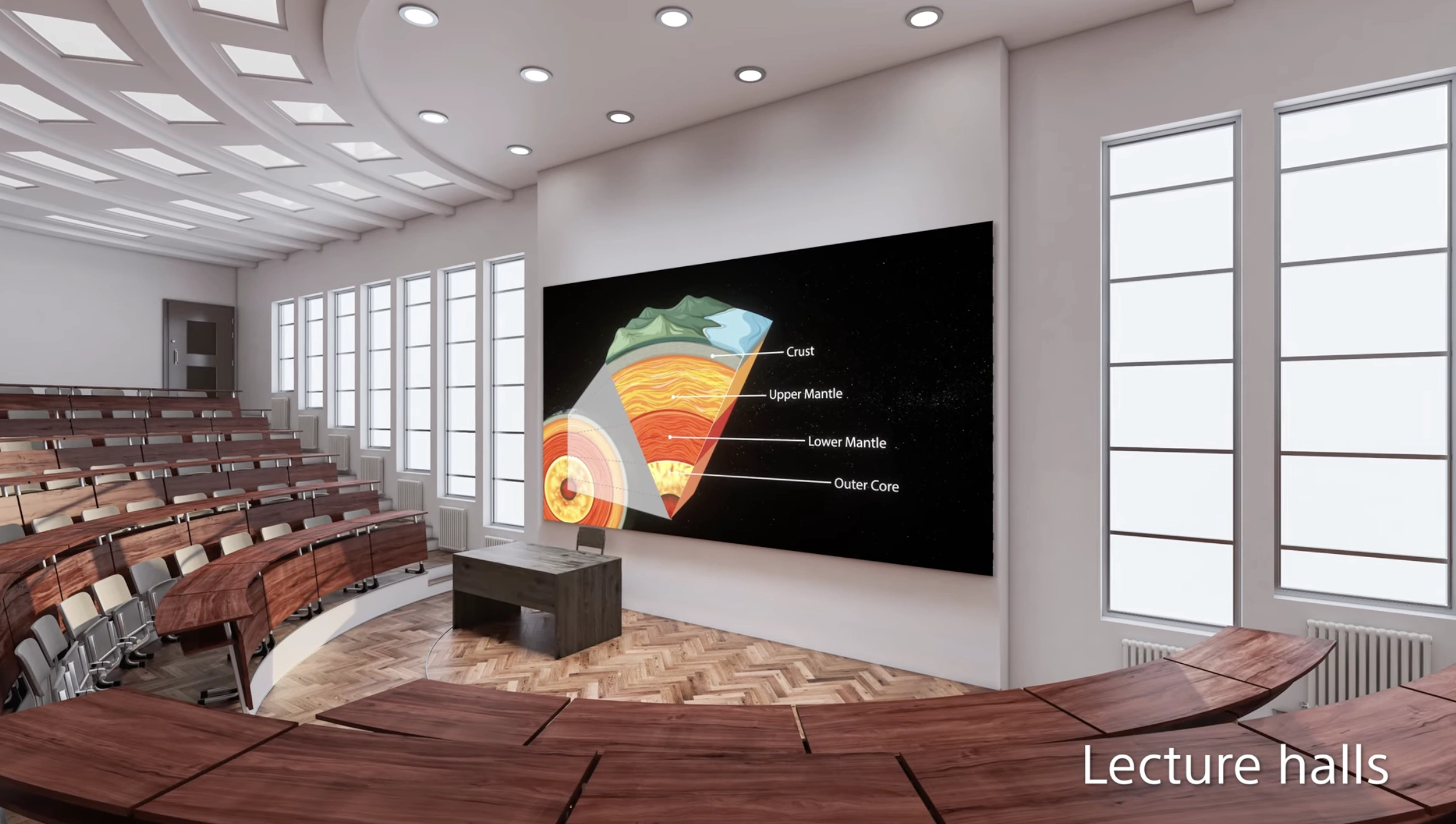 В промо-ролике Sony показывают, что подобные экраны также могут стать частью лекционных залов:
