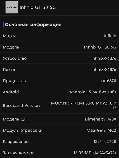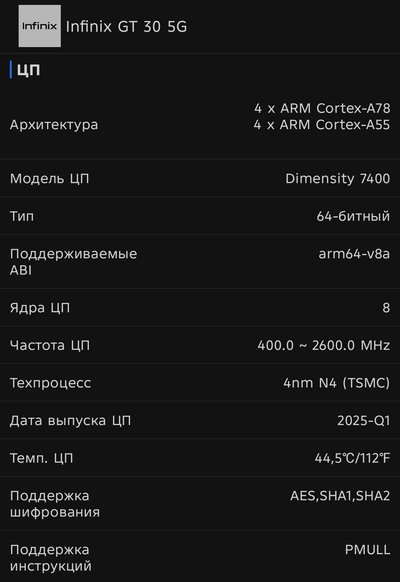 Сердцем GT 30 стал среднеклассовый чип MediaTek Dimensity 7400. Он выполнен по четырехнанометровому техпроцессу и имеет восемь ядер (четыре Cortex-A78 с частотой 2,6 ГГц и четыре Cortex-A55 с частотой 2 ГГц). За графику отвечает ускоритель Mali-G615 MP2 с частотой 1,3 ГГц, двумя вычислительными и 128 шейдерными блоками. Его общая производительность оценивается в 665 гигафлопс.
