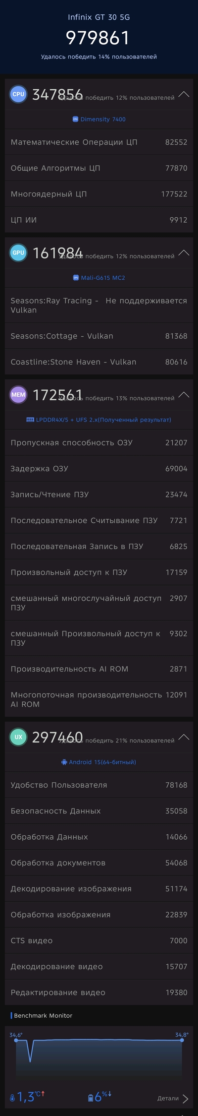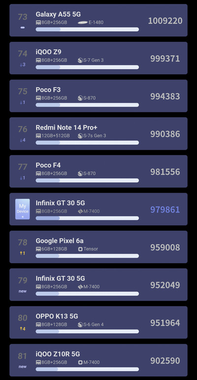 В AnTuTu 11 телефон набрал 979 861 очков, превзойдя результат GT 20 Pro на 40 тысяч очков: